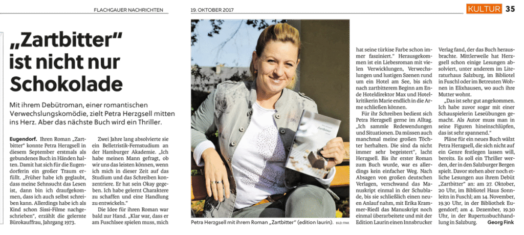 „Zartbitter“ ist nicht nur Schokolade – so lautet die Überschrift in den Flachgauer Nachrichten zu meinem Debütroman.